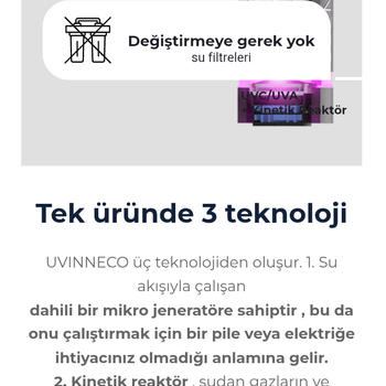 Filtresiz, tanka ihtiyacınız yok,litre sorunu yok. Takın ve temiz su içmeye başlayın. Tamamen teknoloji ultra viole ışınlarıyla suyu en kötu bakterileri öldürüyor. Suyu en zengin minerallerle size sunuyor.özel kinetik reactor mazgal sistemiyle suyu ayristiriyor. Usta artık evinize ugramicak. Dünyada yeni ürün Türkiye'ye getirdik insaliga hizmet çünkü hiç bir firma bunu görmek istemez