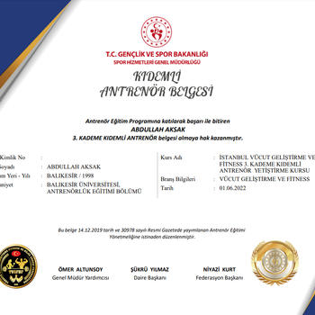 3. Kademe Kıdemli Fitness Antrenörü Balıkesir Merkez'de kendi spor salonumda veya yeterli ekipmanı bulunan salonlarda ders verebilirim. Antrenör belgemi Türkiye Vücut Geliştirme, Fitness Federasyonundan almış olup yasal olarak özel ders vermek için gerekli bütün prosedür ve donanıma sahibim.