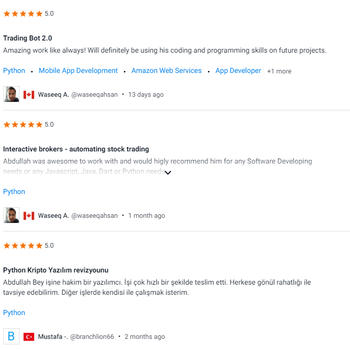 Adım Abdullah, Hacettepe Üniversitesi Bilgisayar Bilimleri lisans öğrencisiyim. Ayrıca, 4+ yıldır mobil&web geliştiriciyim. Android için bazı oyunlar ve uygulamalar yaptım ve bunlar Google tarafından yayınlandı. Şu anda React.js, Flutter, Node JS, Socket.io ve Express kullanıyorum. Ayrıca Javascript, Java, Dart, Python bilgim var. MongoDb (SQL Yok) ve MySql (w/php) konusunda veri depolama deneyimlerine sahibim. Bunların dışında müşterilerim için Borsalar'da 7/24 çalışan trading botlar programlıyorum