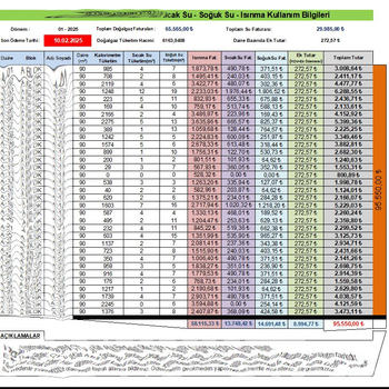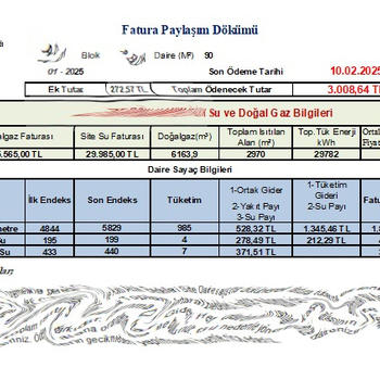 6 senedir yüzlerce bağımsız bölüm için sıcak su, soğuk su, ısınma sayaç okuma ve ücretlendirme hizmeti vermekteyim. Faturalar ile beraber ana tablolar ve ayrıca detaylı fatura paylaşım dökümleri renkli olarak hazırlanmaktadır. Kademeli ücretlendirmeye uygun olarak ücretlendirme yapılmaktadır.