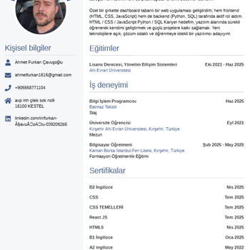 Yönetim Bilişim Sistemleri mezunuyum. Web tasarım ve görsel iyileştirme konularında destek sunabilirim. frontend alanında kendimi fazlasıyla geliştirdim ve bu alana yönelik kırktan fazla profesyonel işim mevvcuttur.