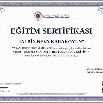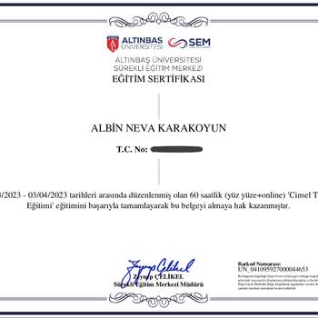 Merhabalar ben Psk. Dan. Albin Neva Karakoyun. Lisans eğitimimden mezun olduktan sonra aile danışmanlığı, çift danışmanlığı, cinsel terapi, ileri düzey hipnoz, travma sonrası stres bozukluğu gibi birçok alanda eğitim aldım. Yaklaşık üç senedir online ve yüzyüze danışmanlık vermekteyim