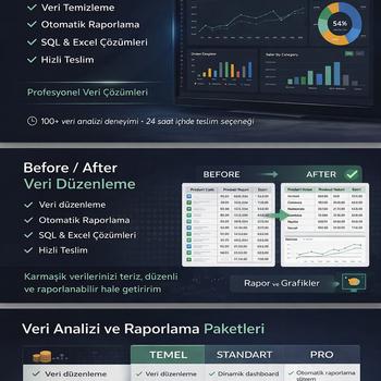 Verilerinizi anlamlı ve kullanılabilir hale getiriyorum. Excel ve SQL kullanarak veri analizi, dashboard oluşturma ve otomatik rapor sistemleri kuruyorum. Manuel yapılan işlemleri otomatikleştirerek zaman kaybını ortadan kaldırıyorum. Karmaşık veri setlerini sade, anlaşılır ve aksiyon alınabilir raporlara dönüştürürüm. İhtiyacınıza özel çözümler geliştirir, hızlı teslim ve net iletişim ile süreci sorunsuz yönetirim. İster tek seferlik rapor, ister sürekli kullanılan bir sistem olsun, işinizi hızlandıracak çözümler sunarım.