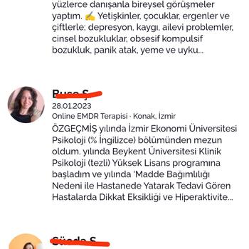 ✍️ Aile Danışmanlığı, Oyun terapisi, EMDR, Bilişsel Davranişçi Terapi, Kısa Süreli Çözüm Odaklı Terapi, Travma ve Yasla Başa Çıkma ve MMPI gibi eğitimler aldım.