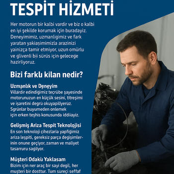 Motor Tamir, Bakım ve Arıza Tespit Hizmeti Her motorun bir kalbi vardır ve biz o kalbi en iyi şekilde korumak için buradayız. Deneyimimiz, uzmanlığımız ve fark yaratan yaklaşımımızla aracınızı yalnızca tamir etmiyor, uzun ömürlü ve güvenli bir sürüş için geleceğe hazırlıyoruz. Bizi farklı kılan nedir? Uzmanlık ve Deneyim: Yıllardır edindiğimiz tecrübe sayesinde motorunuzun en küçük sesini, titreşimini ve işaretini doğru okuyabiliyoruz. Sorunlar büyümeden önlemek için erken teşhis konusunda iddialıyız. Gelişmiş Arıza Tespit Teknolojisi: En son teknoloji cihazlarla yaptığımız arıza tespiti, gereksiz parça değişimlerinin önüne geçiyor, zaman ve maliyet tasarrufu sağlıyor. Güvenilir Bakım: Tamir kadar bakımın da önemli olduğuna inanıyoruz. Düzenli bakım paketlerimizle motor performansınızı artırıyor, yakıt tasarrufu sağlıyoruz. Müşteri Odaklı Yaklaşım: Bizim için her araç bir sayı değil, her müşteri bir dosttur. Tüm süreci şeffaf şekilde aktarır, sizi teknik detaylarla yormadan en uygun çözümü sunarız.