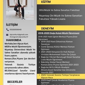 Merhaba ben Alpcan Kurt MEB te Müzik Öğretmeniyim Hikmet Barutçugil Güzel Sanatlar Lisesin de görev yapıyorum Nişantaşı Üniversitesi Müzik ve Sahne Sanatları alanında yüksek lisans yaptım Keman Gitar Piyano Şan dersleri veriyorum Yetenek Sizsiniz Türkiye yarışmasında sahne aldım BİLSEM Güzel Sanatlar Lisesi,üniversite yetenek sınavlarına öğrenci hazırlıyorum aynı zamanda sosyal medya içerik üreticisiyim