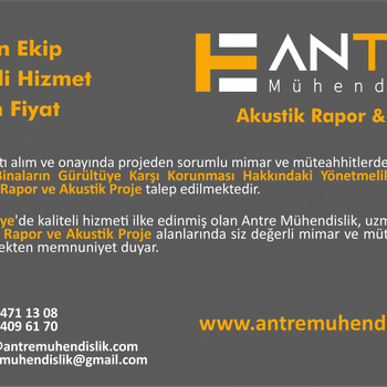 31 mayis 2017 tarihinde yayimlanan ‘’Binalarin gürültüye karşı korunmasi’’ hakkindaki yönetmeliğe göre yeni yapi ruhsat onay aşamasinda belediyeler tarafindan istenen, akustik rapor ve proje ihtiyaclariniz D1 sertifikali deneyimli akustik uzmanlarimiz tarafindan hazirlanmaktadir. Raporumuz program ciktisi haric 60-100 sayfa arasi proje buyuklugune gore degismektedir . Akustik rapor ve projelerinizde sizinle calismak isteriz. Tüm Türkiye’de antre mühendislik olarak hizmet vermekteyiz.
