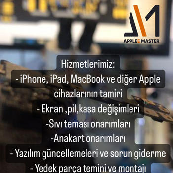 Applee Master olarak, İstanbul'da Apple cihazlarınıza özel teknik destek sunuyoruz. Her türlü sorunuz ve teknik gereksinimleriniz için bize ulaşmaktan çekinmeyin. Size yardımcı olmaktan mutluluk duyarız. Teknoloji dünyasında sorunsuz bir deneyim yaşamak için doğru adrestesiniz! Hizmetlerimiz: - iPhone, iPad, MacBook ve diğer Apple cihazlarının tamiri - Ekran değişimi, pil değişimi,sıvı hasarı onarımı ve daha fazlası - Yazılım güncellemeleri ve sorun giderme - Veri kurtarma ve yedekleme hizmetleri - Hızlı ve yerinde tamir seçenekleri ;