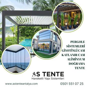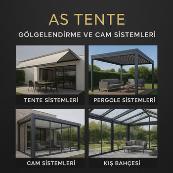 AS TENTE 12 yıllık deneyimi ile alüminyum ve gölgelendirme sistemleri alanında üretici, uzmanlaşmış bir firmadır. Özellikle hoteller, restoranlar, kafeler, inşaat ve mimari projeler için fonksiyonel ve estetik çözümler sunmaktayız. Ürün yelpazemizde; Açılır-kapanır tente ve pergole sistemleri, Plaj Şemsiyeleri ve kumaş değişimi ve aliminyum jüt gölgelendirme Giyotinli cam Katlanır cam balkon Pergola ve kış bahçeleri, Cam tavan & cam oda çözümleri, Halı saha ve Tenis Kortu Tel yapımı Restoran, otel ve konut projelerine özel gölgelendirme sistemleri Aliminyum plaj gölgelik sistemleri Aliminyum otopark gölgelendirme sistemleri yer almaktadır. Aliminyum doğrama Asma germe branda ve tente