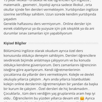 13 yıldır (Daha üniversiteyken ) ilkokul - ortaokul ve lise ögrencileri için ingilizce, matematik, biyoloji ayrica sadece ilkokul, orta okullar içinde fen dersleri vermekteyim .( Burada çok önce üye oldum ancak yeni 2025 te üstüne düştüm) . //Referans isterseniz özelden numaralar iletebilirim //Bunun dışında sayısal derslerim iyi olduğu için lise fizik - kimya dersleri verdiğim de oldu . Ama bu sene artık fizik ve kimya derslerini bırakıp asıl alanım olan Biyoloji / fen bilgisi ve ingilizce ve çokta sevdiğim matematik dersleri ile devam edeceğim . Ayrıca çocukları aşırı sevdiğim ve bu işin daha da hakkını vermek istediğim için küçük yaş grubu oyunlarla ders öğretim tekniklerinde de profesyonel oldum . Senelerdi 2.5/6 yaş grubu ingilizce dersi de veriyorum. Yurtdışında ingilizce üzerine sertifika sahibim. Uzun sürede kendim yurtdışında yaşadım. Burada çevirmenlik yaptım . Genelde haftasonu ders vermiyorum . Online dersler için esnek olabiliyoruz ya da yüz yüze için çok sıkışıklıkta ya da ani durumlar ( genelde sınav zamanları) için yapabiliyorum. Kisisel Bilgiler Bölümümü İngilizce/ biyoloji olarak okudum ayrıca özel ders konusunda oldukça deneyim sahibiyim. Dersleri ögrencilere sevdirecek biçimde anlatmaya çalisiyorum ve bu konuda oldukça kendime güveniyorum. Ders zamanlarini ögrencinin istegine göre ayarliyorum. Kendi ögretmenlerimin çocuklarina da yillardir ders vermekteyim. Kolejle ve devlet okuluyla yillarca çalistim .