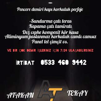 Demir doğrama -pencere demiri kapı korkuluk ferforje - sundurma çatı teras kapama çatı tamiratı - dış cephe kompozit kör kasa - Asma kat ofis yapımı - Aliminyum paslanmaz korkuluk camlı camsız - Panel tel çimcit vs. - ve daha demir çelik ile alakalı işleriniz itina ile yapılır irtibat - Atakan Tekay