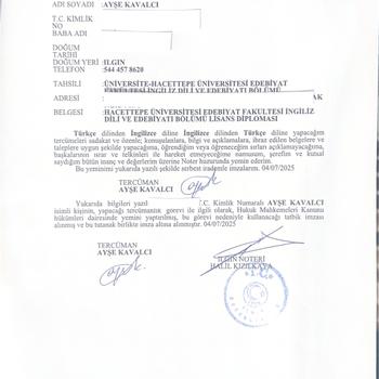 Merhaba, ben Ayşe Kavalcı. Hacettepe Üniversitesi İngiliz Dili ve Edebiyatı mezunuyum, pedagojik formasyon eğitimi alarak İngilizce öğretmenliği sertifikası edindim ve İngilizce dilinde yeminli tercüman olarak hizmet veriyorum. Çeviri yaparken yalnızca kelimeleri değil, aynı zamanda kültürel bağlamı ve metnin ruhunu da aktarmaya özen gösteriyorum. Uluslararası satış, eğitim ve gönüllülük projelerinde edindiğim deneyim sayesinde farklı alanlardaki terminolojiye hâkimim. Akademik, ticari ya da resmi belgelerde müşterilerime hızlı, doğru ve özenli çeviri hizmeti sunuyorum. Detaylara verdiğim önem, disiplinli çalışma tarzım ve yeminli tercümanlık yetkinliğim beni diğerlerinden ayırıyor. Amacım, size yalnızca doğru bir çeviri değil, aynı zamanda güvenilir ve profesyonel bir işbirliği sunmak.