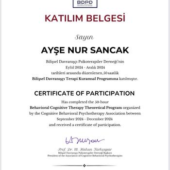Merhaba, ben Psikolog Ayşenur Sancak. Dokuz Eylül Üniversitesi Psikoloji Bölümünden onur derecesiyle mezun oldum. Bilişsel Davranışçı Terapi ve Kısa Süreli Çözüm Odaklı Terapi eğitimleri aldım. Şu anda aktif olarak çevrimiçi ortamda ergenler ve yetişkinlerle bireysel seanslar yürütüyorum. Terapi yaklaşımım, her bireyin kendine özgü bir hikâyesi olduğunu kabul ederek ilerler. Danışanlarımın kendilerini daha iyi tanımalarını, duygularını yönetebilmelerini ve hayatlarına daha sağlıklı bir yön verebilmelerini hedefliyorum. Seanslarda hazır çözümler sunmak yerine, birlikte anlamaya ve kalıcı değişim yaratmaya odaklanıyorum. Çalışmalarımda şema odaklı bilgilerimden de yararlanarak, kişilerin çocukluktan gelen düşünce ve davranış kalıplarını fark etmelerine destek oluyorum. Empatik, sıcak ve yargılamadan dinleyen bir yaklaşımla, her danışanın kendi hızında ilerlemesine alan tanıyorum. Kendinize doğru atacağınız bu adımda size eşlik etmekten memnuniyet duyarım.