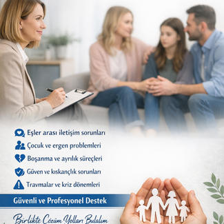Aile içi iletişim problemleri, çift çatışmaları ve ebeveyn-çocuk ilişkilerinde danışmanlık hizmeti veriyorum. Güvenli ve destekleyici bir ortamda çözüm odaklı birlikte ilerleyebiliriz.