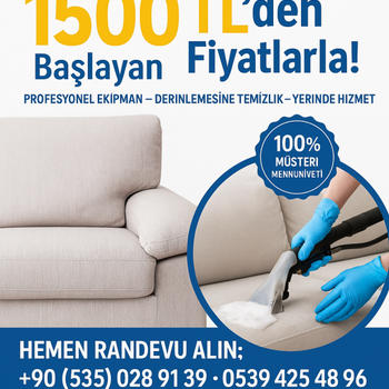 Bizi tercih edin pişman olmayin. Profesyonel ekip ve ekipmanlarimiz ile %100 hijyen ve temizlik garantisini vererek koltuk,yatak,sandalye ve kumas kapli tum yüzeyleri sulu BUHARLI yikama ile derinlemesine temizliyoruz. Temizlik kurallarina uygun olarak hizmetlerimiz devam ediyor. Hizmetlerimizden yararlanmak için bizimle iletisime geçebilirsiniz.