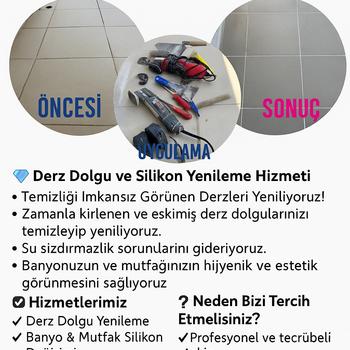 ✓ Banyo,WC,mutfak ve balkon gibi tüm mekanlarınızın derzleri raspa makinesi,elmas uç ve el ile özenle temizlenir ve silikon esaslı derz doldu ile yenilenir. ✓ Kesinlikle derz üzerine derz yapılmaz. İlk günkü gibi tertemiz olur.Alt daireye sızdırmazlık sağlanır. ✓Cam balkon,pvc, duşakabin,lavabo,tezgah, mutfak tezgahı, pencere küpeşte önü gibi kararmış küflenmiş siyahlaşmış ve kötü bir görüntüsü ve koku oluşan silikon ve mastikleriniz , kararmayan ve Sista Marka akvaryum silikonu ile yenilenir. ✓ İlk günkü gibi tertemiz oluyor. ✓ Yaşam alanlarınıza değer katıyoruz.