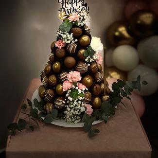 El yapımı butik çikolata, isteme çikolatası,nişan cikolatasi kişiye özel,konsepte uygun farklılık arayanlara çiçekli kule pasta