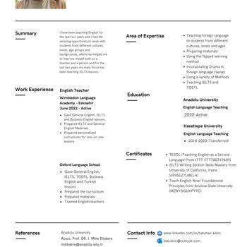 I have been teaching English for the last four years and I had the amazing oppurtunity to work with students from different cultures, levels, age groups and backgrounds, which has helped me to improve myself both as a teacher and a person and for the last two years my main focus has been teaching IELTS lessons. Currently I am working at Free Talk China, which is an Online Teaching platform based in China. I give onlnie IELTS lessons to students from China and I also work at Wimbledon Language Academy in Eskişehir and I give IELTS, Speaking, General English and Business English Lessons.