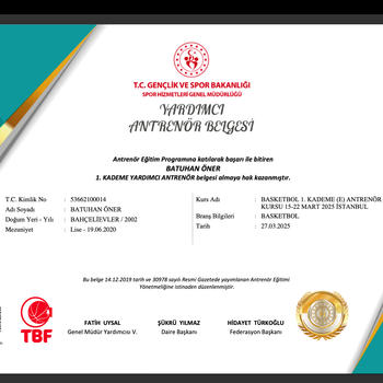 Merhabalar ben Batuhan Öner yaklaşık 12 yıldır Basketbol oyunun içindeyim ve 3 yıldır basketbol antrenörlüğü ve atletik performans alanında sporcularla birebir çalışıyorum. Celal Bayar Üniversitesi Spor Bilimleri Fakültesi öğrencisiyim ve öğretmenlik formasyonu eğitimi almaktayım. Amacım; sporcuların teknik becerilerini geliştirirken aynı zamanda hız, kuvvet, çeviklik ve dayanıklılık gibi temel performans özelliklerini en üst seviyeye çıkarmaktır. Antrenmanlarımız, gerekli tüm ekipmanlara sahip profesyonel bir spor salonunda gerçekleştirilmektedir. Her sporcunun seviyesine ve hedeflerine uygun bireysel antrenman programları oluşturarak gelişimi yakından takip ederim.