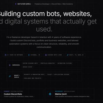 Merhaba, ben Batu. Freelance olarak kisilere, topluluklara ve projelere ozel yazilim hizmeti veriyorum. Ozellikle Discord botlari, sunucu sistemleri ve ozel web siteleri konusunda calisiyorum. Ticket, basvuru, partnerlik, moderasyon, guvenlik, muzik, ekonomi, ozel komutlar ve farkli otomasyon sistemlerini ihtiyaca gore sifirdan gelistirebiliyorum. Calisma sekilimde en cok onem verdigim sey, karsidaki kisinin ihtiyacini dogru anlayip ona uygun, temiz ve kullanisli bir cozum sunmak. Hazir kaliplarla gecistirmek yerine, mumkun oldugunca istege ozel ve duzenli is cikarmaya dikkat ediyorum. Eger yaptirmak istediginiz bir bot, internet sitesi ya da size ozel bir yazilim fikri varsa, detaylari birlikte konusup en uygun sekilde ilerleyebiliriz.