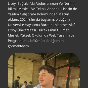 Merhabalar ben Berat , 19 yaşındayım.Liseyi İstanbul da Bağcılar Abdurrahman ve Nermin Bilimli MTAL de Yazılım geliştirme olarak bitirdim şu an Burdur Mehmet Akif Ersoy Üniversitesi,Emin Gülmez MYO da Web tasarım ve kodlama 1. Sınıf öğrencisiyim. Lise döneminden beri Çok sayı da Web sitesi ve Logo tasarımı işlerinde görev aldım sizler için buradayım.
