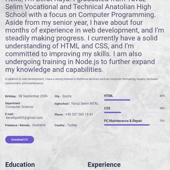 Merhaba, ben Berat Kaya. Yavuz Selim Mesleki ve Teknik Anadolu Lisesi Bilgisayar Programcılığı bölümünden mezun oldum. Dokuz ay boyunca devlet hastanesinin bilgi işlem biriminde çalışarak teknik sorun çözme, sistem yönetimi ve kullanıcı desteği konularında deneyim kazandım. Web tasarımı ve yazılım geliştirme alanlarına ilgi duyuyorum, bu konularda kendimi sürekli geliştirerek daha büyük projelerde yer almayı hedefliyorum.