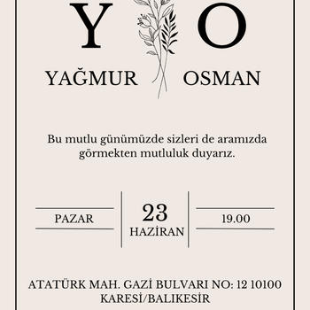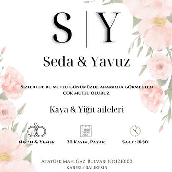 Merhaba, ben Berika. Kişiye özel veya yapmış olduğum tasarımlar üstünden düğün,nikah, nişan, kına gecesi, doğum günü vb. özel günleriniz için davetiye tasarımı yapmaktayım.