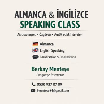 Merhaba ben Berkay Menteşe. Almanca ve İngilizce öğrenip anladığı halde konuşamayan çok kişi var ve sebep genelde yanlış yöntemler. Derslerde odak tamamen speaking pronunciation ve gerçek hayatta kullanılan dil üzerine. Ezber gramer yükü yok dil yaşayarak öğreniliyor. Kişiye özel hazırlanan program deneme dersiyle belirleniyor ve dersler öğrencinin seviyesine ve hedeflerine göre şekilleniyor. Online sistem üzerinden ilerleyen derslerde bol pratik var hata yapmaktan çekinmeden konuşulan rahat bir ortam var. Amaç Almanca ve İngilizceyi özgüvenle akıcı ve doğal şekilde kullanabilmek günlük hayatta işte ya da seyahatte dili gerçekten konuşur hale gelmek.