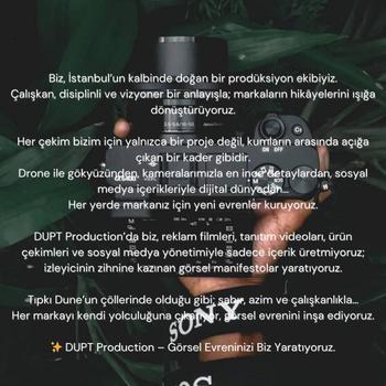 Dupt Production olarak markaların hikayelerini en etkileyici şekilde anlatıyoruz. İstanbul merkezli prodüksiyon ekibimiz; tanıtım filmleri, reklam videoları, müzik klipleri, kısa filmler, drone çekimleri, ürün videoları ve sosyal medya içerikleri üretiyor. Yaratıcılığı profesyonel ekipmanla buluşturuyor, her projede markanın kimliğine özel özgün bir görsel dil oluşturuyoruz. Amacımız, izleyenlerin aklında kalacak güçlü ve estetik videolarla markanızı bir adım öne taşımak. Kısacası, “görün, fark yaratın, hatırlanın!”