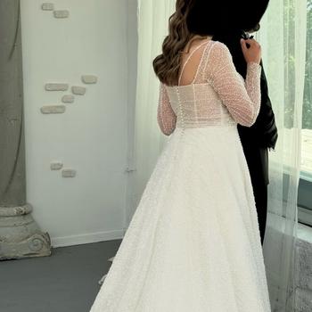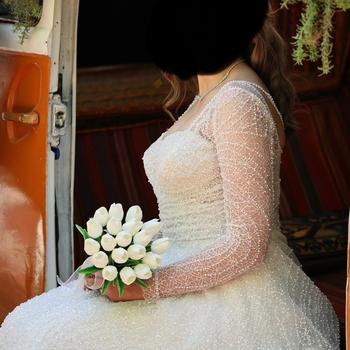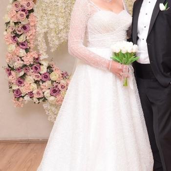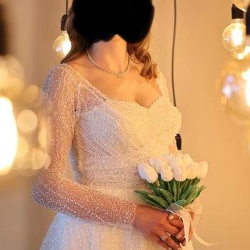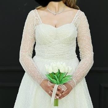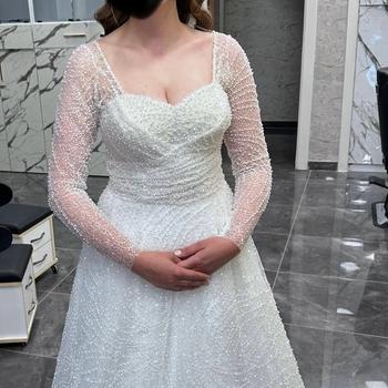 42-44 bedene kadar olabilir gelinlik full taşlıdır. Kuru temizlemesi yapılmıştır. Arkası düğmelidir. 2 tane duvak vardır biri uzun biri kısa kısa olanın inci işlemesi vardır.