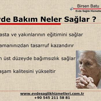 Evde Hasta /Yaşlı hizmetlerinin faydaları - evde bakım hizmetlerinin kullanımı Etkin bakımı sağlar ve maliyeti kurumsal bakımdan daha ucuzdur - evde bakım yaşlı hasta tercihini göz önüne alarak teknolojik araç kullanımına olanak sağlar ve hizmetin kalitesini arttırır - bakımın devamlılığını ve denetlenebilirliğini sağlar - evde bakım bazı bireylere ulaşmada tek çözüm olup kişiye özel bakımın yapılmasını sağlar -Şirketimizde güvenle itina ile hizmet vermekteyiz - Türkiye'nin her yerine güvenle hizmet vermekteyiz - resmi istihdam bürosuyuz - Hemen her şehirde kuvvetli referanslarımız bulunmaktadır