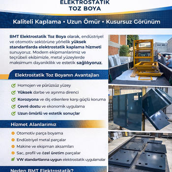 Özel renk seçenekleri Hızlı teslimat Uygun fiyat Elektrostatik toz boya hizmetimiz kapsamında; • Demir, çelik ve alüminyum yüzey boyama • Pas temizleme ve yüzey hazırlık işlemleri • Fırınlı boya uygulama • Endüstriyel ve bireysel işler Kaliteli malzeme ve profesyonel ekip ile hizmet vermekteyiz.