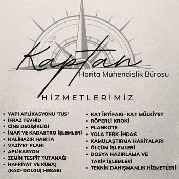 Kaptan Harita Mühendislik Bürosu; profesyonellik, memnuniyet, süreklilik ekseninde, işlerinizde, yılların verdiği iş tecrübesi ile çözüm ortağınız olarak, Harita Mühendislik Hizmetleri kapsamında, Yapı Aplikasyonu (TUS) , İfraz Tevhid , Cins Değişikliği , İmar ve Kadastro uygulamaları, Halihazır Harita , Vaziyet Planı , Aplikasyon(Arazi.Arsa,Tarla Konum Belirleme) , Zemin Tespit Tutanağı , Hafriyat ve Kübaj (Kazı ve Dolgu) Hesabı , Kat İrtifakı ve Kat Mülkiyeti , Röperli Kroki , Plankote , Yola Terk-İhdas , Kamulaştırma Haritaları , Ölçüm İşlemleri , Dosya Hazırlama ve Takip İşlemleri , İskan Alma , Mimari Proje Çizimleri , Teknik Danışmanlık Hizmetlerini firmanız olarak yüklendiği işleri, yüksek sorumluluk , hızlı ve başarılı bir şekilde yapmaya devam ediyor.