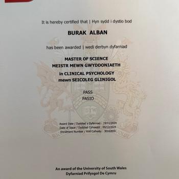 Klinik Psikolog Burak Alban, lisans eğitimini Sabancı Üniversitesi Psikoloji bölümünde, yüksek lisansını ise Galler’de University of South Wales bünyesinde Klinik Psikoloji alanında tamamlamıştır. Lisans sonrası, Marmara Üniversitesi Aile Danışmanlığı programında eğitim almış ve süpervizyon sürecini başarıyla tamamlamıştır. Türkiye’de Erenköy Ruh ve Sinir Hastalıkları Hastanesi’nde zorunlu stajını gerçekleştirmiş; AMATEM biriminde çeşitli bağımlılık türlerine ilişkin klinik süreçleri gözlemleme fırsatı bulmuştur. Yüksek lisans sürecinde ise Galler’de bir ortaokulda göçmen çocuklarla psikososyal destek çalışmaları yürütmüş ve kültürel uyum ile duygusal düzenleme alanlarında saha deneyimi kazanmıştır. Yüksek Lisans Tez araştırmasında sosyal bağlılık ve aidiyet duygularının sosyal çevre ve dijital arkadaşlık uygulamalarıyla ilişkisini inceleyen Alban, bu perspektifi ilişkisel dinamikler, modern bağlanma örüntüleri ve bireylerin yaşamla kurdukları ilişkiyi anlamada temel bir çerçeve olarak kullanarak danışanlarla çalışmasını yürütmektedir.