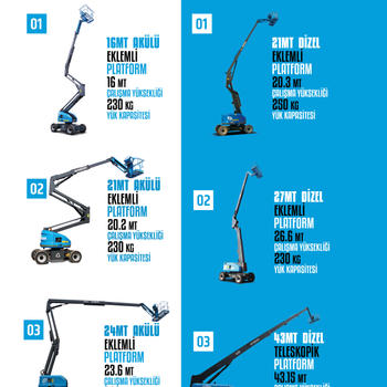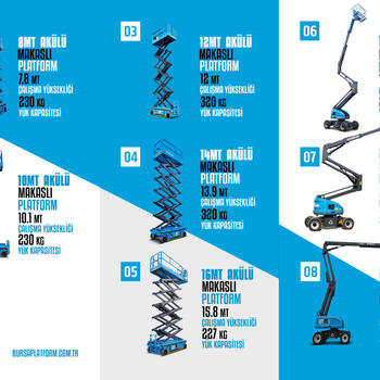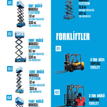 30 YILLIK TECRÜBEMİZLE 3 METREDEN 43 METRE KADAR MAKASLI EKLEMLİ TELEKOPİK MANLİFT FORKLİFT VE KONTEYNER KİRALAMA HİZMETİ YAPAN BURSA VE İZMİR İLERİNDE FAALİYET GÖSTEREN FİRMAMIZ 400 ADET MAKİNA İLE SAHADA YILLIK AYLIK VE GÜNLÜK HİZMET VERMEKTEDİR. UYGUN KİRALAMA KOŞULLARI İLE YENİ MODELLİ MAKİNALAR İLE KONFOR SAĞLAMAKTAYIZ.