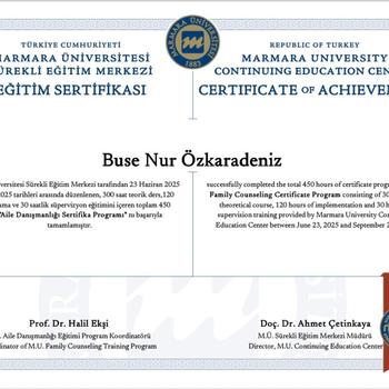 Marmara üniversitesi sürekli eğitim merkezi Aile Danışmanlığı sertifikasına sahip daha önce çiftlerle ve ailelerle çalışmış psikolojik danışmanım. Size ve ailenize destek olmak için burdayım.
