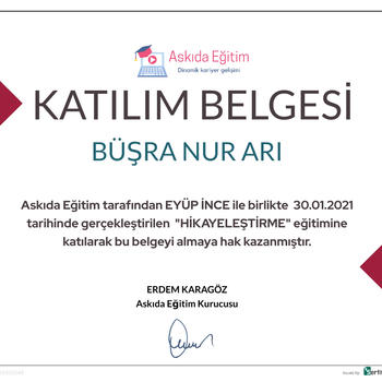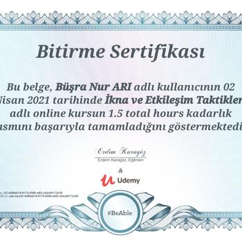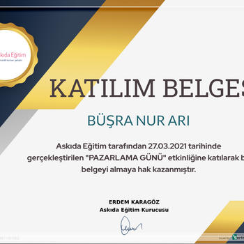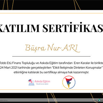 PROFİL 20/06/2000 Manisa doğumluyum. Şubat 2021-2022 tarihleri arasında Askıda Eğitim Pazarlama ve Organizasyon Departmanı’nda aktif rol aldım.Mayıs 2021’den itibaren Türk Kızılay gönüllüsüyüm. Satış ve pazarlama konusunda kendimi her alanda geliştiriyorum. BECERİLER Hedeflere uygun performans gösterme Memnuniyet odaklı çalışma Takım bilincine sahip olma ve takımmenfaatlerine uygun hareket etme İkna kabiliyetinin yüksek olması Yeniliğe ve kendini geliştirmeye açık olma EĞİTİM GEÇMİŞİ İSTANBUL ÜNİVERSİTESİ AUZEF - İnsan Kaynakları Yönetimi /Lisans (2020-2024) İZMİR BAKIRÇAY ÜNİVERSİTESİ Sosyoloji Bölümü/Lisans (2020-2024) KARİYER ÖZETİ BOĞAZİÇİ CAMPUS | 03.08.2021-Bitti | AŞKIM KAPIŞMAK İLE YAŞAM KOÇLUĞU EĞİTİMİ STAJ/SPOR CENTER ACEDEMY | 28.06.2021- 26.07.2021 | İnsan Kaynakları Departmanı Halk ve İlişkiler Faaliyet Alanı Projelendirme BORAN E-TİCARET | 16.06.2021 - 06.07.2021| Satış Departmanı ASKIDA EĞİTİM| Organizasyon Departmanı Üyesi | Şubat 2021 - 2022 | Pazarlama Departmanı Üyesi | Şubat 2021 - 2022 |