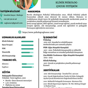Merhaba, Psikoloji lisans ve Klinik Yüksek lisansımı onur ve yüksek onur dereceleri ile tamamlayıp 2016 yılından beri çocuk ve yetişkinler ile çalışmaktayım. İstanbul Anadolu yakasında klinikte yüz yüze veya online terapi hizmeti sağlayabilirim. Şema terapi, bilişsel davranışçı terapi, cinsel terapi, oyun terapisi, aile danışmanlığı, formasyon ve test eğitimlerim mevcuttur. Detaylı bilgi için psikologcaglaanar.com web sitemi ya da instagram hesabımı ziyaret edebilirsiniz.