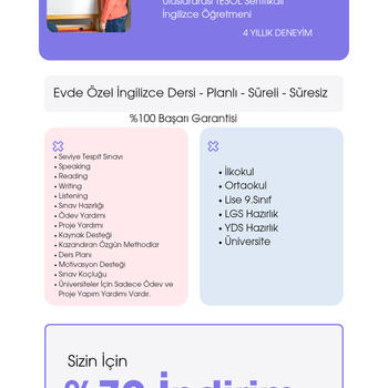 4 yıldır İngilizce öğretmenliği yapıyorum. Çocuklarımızın okulda speaking sınavlarından tam not alması için uğraşıyorum. Yeni sınav sistemine göre ilerliyorum. Telaffuz çalışması yaparak ilerliyoruz. Müfredata uygun her konu üzerinden detaylı konuşma pratiği yapıyor ve konuşma konusunda özgüven kazandırarak ilerliyoruz.