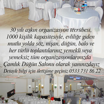 Yılı aşkın süredir mutluluğa hizmet ediyoruz. Bizden fiyat almadan karar vermeyin. Bilgi ve rezervasyon için iletişime geçiniz. https://www.instagram.com/camlik_dugun_salonu/ https://camlikdugundavet.com/