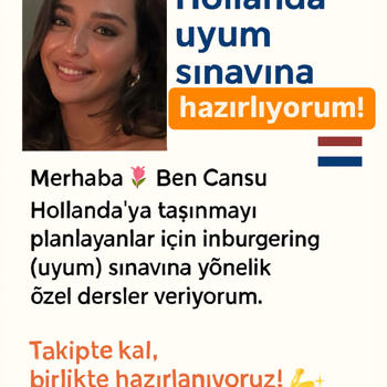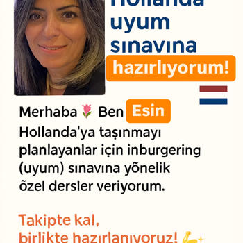 Merhaba Biz Esin & Cansu Hollanda’ya taşınmayı planlayanlar için inburgering (uyum) sınavına yönelik Hollandanın onaylı hazırlık kursu “Naar Nederland” paketinden özel dersler veriyoruz. -Online birebir dersler seviyene göre kişisel plan. -Sınav simülasyonları gerçek testlere benzer alıştırmalar -Hızlandırılmış program kısa sürede sonuç isteyenler için -Kültürel rehberlik Hollanda yaşamına kolay uyum -Süreç boyu rehberlik ediyoruz, birlikte hazırlanıyoruz!