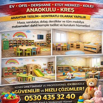 Arkadaşlar anahtar teslim ev-ofis-dershane-etüt merkezi-kolej tadialat kurulum (masa,sandalye,dolap derslikler dahil) sözleşmeli olarak yapılır. Kendi imalatımızdır.