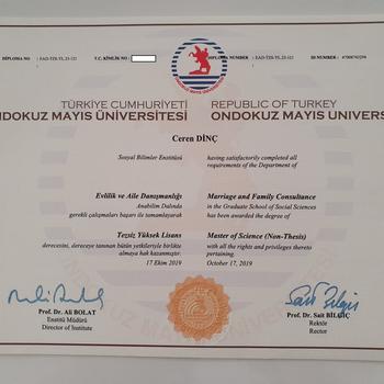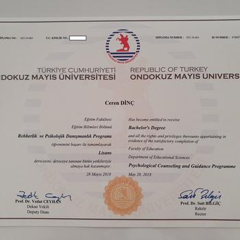 Ondokuz Mayıs Üniversitesi - Psikolojik Danışmanlık ve Rehberlik 'Lisans Ondokuz Mayıs Üniversitesi - Evlilik ve Aile Danışmanlığı 'Yüksek Lisans Arel Üniversitesi - Psikoloji 'Yüksek Lisans