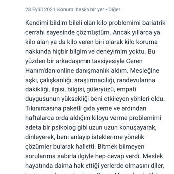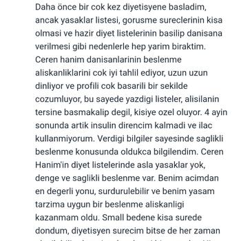 "Diyette yasak yoktur" mottosu ile çıktığım bu yolda sayısız danışanım yalnızca sağlıklı beslenmeyi öğrenerek kalıcı kilolar verdi. Nasıl Çalışırım? Adım 1: Size, bir tanıma ve besin tüketim kaydı formu gönderirim. Formu dürüstçe cevapladığınızda; artık nasıl beslendiğinizi,hastalıklarınızı,tükettiğiniz-tüketmediğiniz besinleri biliyor, beslenme alışkanlıklarınızı tamamen analiz edebiliyor olurum. Adım 2: Online veya kliniğimde yüzyüze görüşmek üzere seans saatimizi belirleriz. Seanslarımız esnasında sizin yanlış beslenme alışkanlıklarınızı tespit eder, onların yerine doğru ve sevdiğiniz sağlıklı alışkanlıkları eklerim. Doğru alışkanlıklarınızı asla değiştirmem. Hayatınızda benim olmadığım zamanlar da olacak. Bunu bildiğim için uygulayamayacagınız alışkanlıkları size edindirmeye çalışmam. Robot olmadığımız gerçeğiyle birlikte hergün aynı beslenme stilini uygulayamayacağınızı bildiğimden diyetlerinizi günlük değil; haftalık olarak planlarım. Böylelikle daha esnek ve çok rahat dengeleyebileceğiniz bir beslenme planınız olur. Adım 3: Her yeni seansımızda bir önceki hafta yapamadıklarımızı değiştirerek diyetinizi tamda size uygun hale getiririm. Aynı zamanda her yeni seans; *Enerji dengesi nedir? Kilo alıp-verme mekanizması nasıl işler? *Sağlıklı beslenme tabağı nasıl oluşturulur? Menülerimizi nasıl planlamalıyız *Diyette kaçamak nedir? Nasıl dengelenir? *Popüler beslenme konuları ve doğru bilinen yanlışlar gibi sağlıklı beslenmeye dair her şeyi size yavaş yavaş öğretirim. Adım 4:En sonunda sağlıklı beslenme rutini olan bir birey olarak yanımdan ayrılırsınız. Danışanlarım danışmanlığımızı sonlandırdıklarında, diyetlerinin normalde de yedikleri olduğunu fark ederler. Özgeçmiş: Diyetisyen ve Gıda bilimci Marmara Üniversitesi Beslenme ve Diyetetik (Lisans) Uludağ Üniversitesi (Master) Şuan Bursa, Nilüfer metro çıkışı bulunan kliniğimde siz danışanlarıma yüzyüze ve online hizmet vermekteyim. .