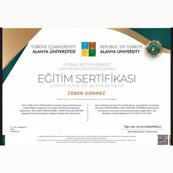 Yaşam koçluğu eğitimimi Boğaziçi Kampüsü & Alanya Üniversitesi onaylı olarak tamamladım. Bu süreçte psikoloji, iletişim ve farkındalık üzerine derinleşerek, bireylerin kendileriyle daha güçlü bir bağ kurmalarına odaklandım. Yürüttüğüm süreçte amacım; hazır çözümler sunmak değil, doğru sorularla kişinin kendi farkındalığını artırmasına ve içsel kaynaklarını keşfetmesine alan açmaktır. Özellikle şu konularda destek sağlıyorum: • Özgüven eksikliği • Kararsızlık ve yön bulamama • Tekrarlayan ilişki döngüleri • Kendini ifade etmekte zorlanma Seanslarımızda birlikte; seni en çok zorlayan noktayı netleştirir, bunun altında yatan düşünce kalıplarını fark eder ve somut adımlar belirleriz. Eğer gerçekten değişmek ve kendine daha net bir yerden bakmak istiyorsan, bu sürece birlikte başlayabiliriz.
