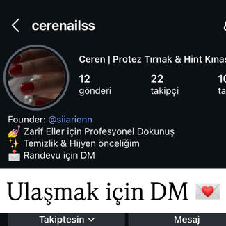 Hakkımda Neden Ben Merhaba Protez tırnak ve Hint kınası alanında uzmanlaşmış bir güzellik uygulayıcısıyım. El estetiğine verdiğim değeri, her müşterime özel ve özenli uygulamalarla yansıtıyorum. Protez Tırnakta: Doğal görünümlü, uzun ömürlü tasarımlar Hijyenik, sağlıklı ve kaliteli uygulama süreci Her zevke uygun form, renk ve detaylarla yaratıcı çözümler Zamanı verimli kullanarak sizi yormadan, profesyonel ve tatmin edici sonuçlar sunuyorum Güzellik detaylarda gizlidir; ben de bu detaylara önem vererek çalışıyorum