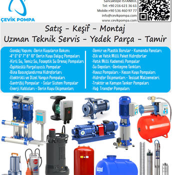 Satış - Keşif - Montaj Uzman Teknik Servis - Yedek Parça - Tamir Sondaj Yapımı - Derin Kuyuların Bakımı 4" 5" 6" 7" 8" 10" Derin Kuyu Dalgıç Pompaları Kirli Su, Temiz Su, Foseptik Su Drenaj Pompaları Ögütücülü Parçalıyıcılı Pompalar Bina Basınçlandırma Hidroforları Elektrikli ve Dizel Yangın Pompaları Santrifüj Pompalar - Solar Sistem Pompalar Enerji Kabloları - Derin Kuyu Ekipmanları Demir ve Plastik Borular - Kumanda Panoları Dik ve Yatık Milli Paket Hidroforlar Yatık Milli Kademeli Pompalar Su Depoları -Genleşme Tankları Havuz Pompaları - Keson Kuyu Pompaları Hidrofor Ekipmanları - Tesisat Malzemeleri Traktör ve Kamyon Tanker Pompaları Yağ Transfer Pompaları