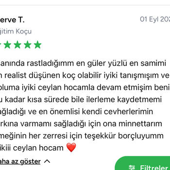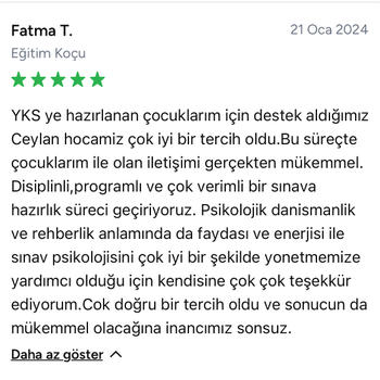 Merhaba ben Eğitim Koçu Ceylan. Marmara üniversitesi psikolojik danışmanlık ve rehberlik mezunuyum. 5 senedir profesyonel olarak bireysel öğrenci koçluğu yapmaktayım. Özel sektörde de eğitim koçu olarak 4 yıldır çalışmaktayım. 2023 YKS Sınavında ilk 600.- 900. ve 1200. olan öğrencilerle çalıştım. Haftalık program her hafta görüntülü aramada 1 saatlik görüşme ile gün gün oluşturulur ve takibi yapılır. Koçluk yaptığım öğrencilerimle her an whatsapp üzerinden iletişim halinde olmakla birlikte aynı zamanda günlük program şeklinde ilerlemekteyiz. Her gün çözdüğü tüm testleri bana whatsapp üzerinden ileterek yanlış yaptığı soruların üzerine gitmesi ve yaptığı stratejik hataları fark etmesi konusunda günlük takip söz konusu olmakta. Aynı zamanda sınav süreci psikolojik bir süreç, stres ve zaman yönetimi, kaygı ve motivasyon da koçluğumun kapsamına girmektedir. ÖSYM sınav soru tarzları ve stratejileri konusunda da öğrencinin çözmüş olduğu sorular üzerinden düzenli olarak geri dönüt sağlanmaktadır. Detaylı bilgi için iletişime geçebilirsiniz.