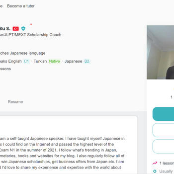Merhabalar, ismim Derin Su. 2 yılda kendi kendime Japonca öğrenip Japonca Dil Yeterlilik Testi'nde (JLPT) en yüksek seviye olan N1'i tek seferde geçtim. Aynı zamanda MEXT Lisans Bursu 2020 yılında Türkiye'den Japonya'ya tıp alanında tavsiye edilen ilk aday oldum. 6 aydır Türk ve yabancı öğrencilere online Japonca öğretmenliği ve MEXT koçluğu yapıyorum. Japonca nasıl öğrenilir, Japonca tek başına çalışarak nasıl geçilir, N1 nasıl geçilir, JLPT sınavına nasıl hazırlanılır, MEXT dosyası nasıl hazırlanır gibi soruları derslerimde cevaplıyorum. İnternette yıllar içinde bulduğum kaynaklar, kitaplar, videolar ve podcastler ile öğrenme sürecini pekiştiriyorum. Eğer Japonca, JLPT veya MEXT Bursu hakkında sorularınız varsa benimle iletişime geçmenizi tavsiye ederim. Blog sayfam: japonyaya-dair.blogspot.com Blog İnstagram sayfa:sı @japonyayadair Kişisel İnstagram sayfam: @derin_sue