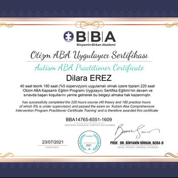 Ben Dilara Erez. Hacettepe Üniversitesi’nden şeref öğrencisi olarak mezun oldum. Mezuniyetim sonrası, Ankara’daki ilk ABA konseptli işbaşı eğitim programında yer aldım ve bu sayede yoğun ve uygulamalı bir deneyim kazandım. Bugün, ABA terapisti ve Floortime terapi uygulayıcısı olarak çalışıyorum. ABA, bilimsel temellere dayanan ve çocukların gelişiminde kalıcı sonuçlar sağlayan bir yöntemdir. Floortime ise çocuğun iç dünyasını merkeze alarak ilişki ve etkileşimi güçlendiren bir yaklaşımdır. Ben çalışmalarımda bu iki yöntemi bir araya getirerek çocukların hem akademik hem de sosyal-duygusal gelişimlerini destekliyorum. Şu anda kendi merkezimde bireysel seanslar yürütüyorum. Her çocuğun ihtiyacına özel hazırladığım programlarla; iletişim, oyun, davranış yönetimi ve bağımsızlık becerileri üzerine çalışıyorum. Ailelerle güçlü işbirliği kurarak sürecin ev ortamında da desteklenmesini sağlıyorum. İnstagram: cocukgelisimuzmani_dilaraerez